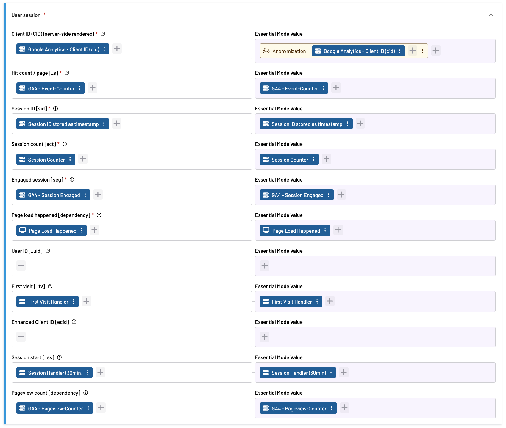 When Essential Mode is activated, it is crucial to set GA4 session parameters with great care to ensure data consistency. While the most important foundation remains the Client ID, which is from our experience often configured with either anonymization or pseudonymization functions applied to improve data privacy, as the data can further not be traced back.