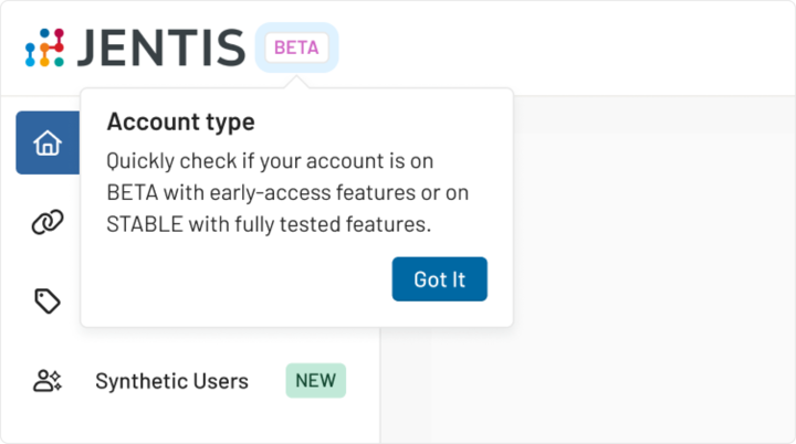 At JENTIS, accounts can be either **BETA** or **STABLE**, depending on whether you prefer early access to new features or a fully production-ready experience. This page explains each account type, how it impacts your experience, and how to request a change.