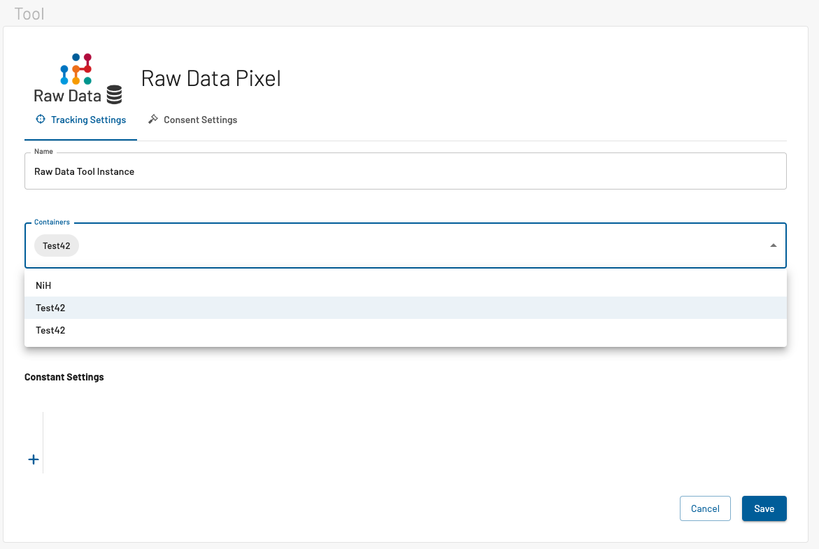 Provide a name for the pixel, select the container for Raw Data tracking, and click "Save" to set up this tool configuration. Enabling the toggle for **automatic installation of default tags** will add essential tags, such as those for tracking pageviews, events, and ecommerce data using the Raw Data tool. You can also modify existing tags or create new ones to track custom events and data on your website.
