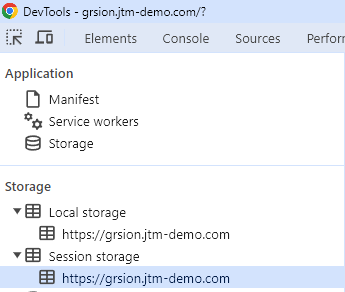 To add these values to the session storage, navigate to your website, and open the developer tools by pressing F12. Then here, navigate to the Application tab and search for your domain in the Session storage on the left side: