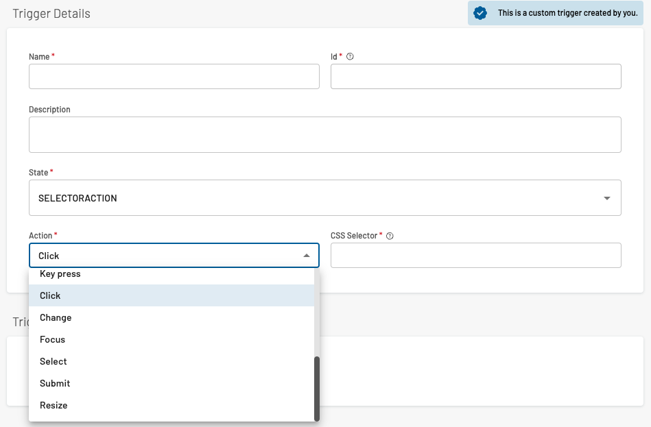 1. Create a new trigger and select “SELECTORACTION” State to use an easy solution.